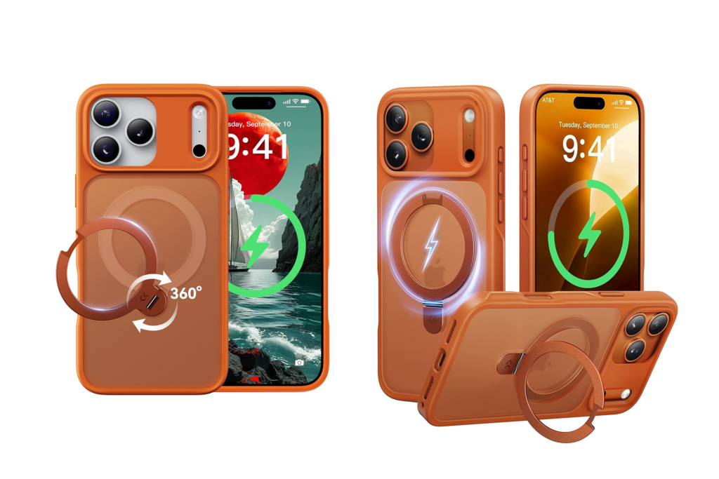 MagicStandの外箱。窓が空いているところには角度を変えるとMagsafeとスタンド機構が交互に見えるレンチキュラー印刷があり、今回の特徴とメーカーの自身がよく分かります。ちなみにどちらも機種はiPhone 17 Pro Max用、カラーはオレンジを送っていただきました。